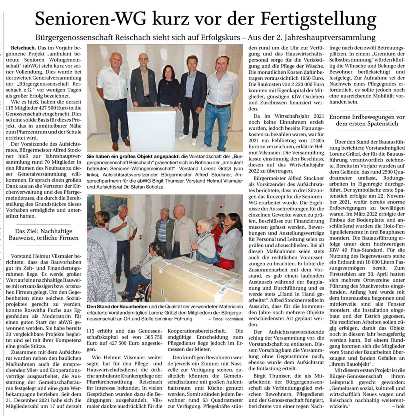 Vor gut einem Jahr wurde die Bürgergenossenschaft Reischach e.V. ins Leben gerufen. Nun konnte sie ihr 100stes Mitglied begrüßen. Mit einer kleinen Überraschung statteten die Verantwortlichen der Genossenschaft Frau Rosa Vilsmaier einen kurzen Besuch ab. „Wir freuen uns sehr über die positive Resonanz und Unterstützung aus der Bevölkerung für die Bürgergenossenschaft und unser Projekt der ambulant betreuten Wohngruppe“ betont Vorstand Helmut Vilsmaier. Nach wie vor können interessierte Bürger Anteile zeichnen und somit die Projekte für Reischach und Umgebung unterstützen. Eine Zeichnung ist jederzeit in der Raiffeisenbank Reischach während den Öffnungszeiten möglich.