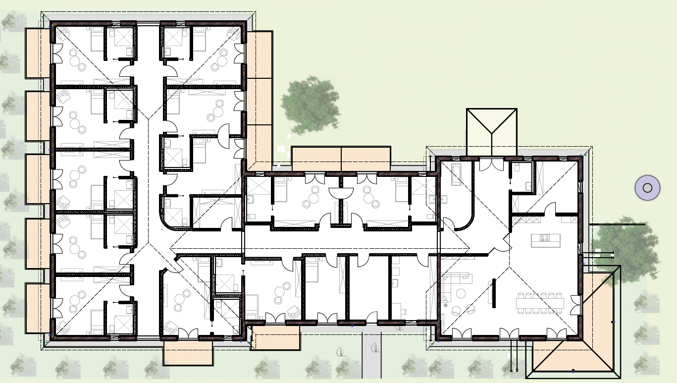 Das Gebäude ist eingeschossig und wird 12 Wohneinheiten haben. Jede Einheit mit eigenen Bad, Toilette und Dusche vorgesehen + eigene Terrasse.